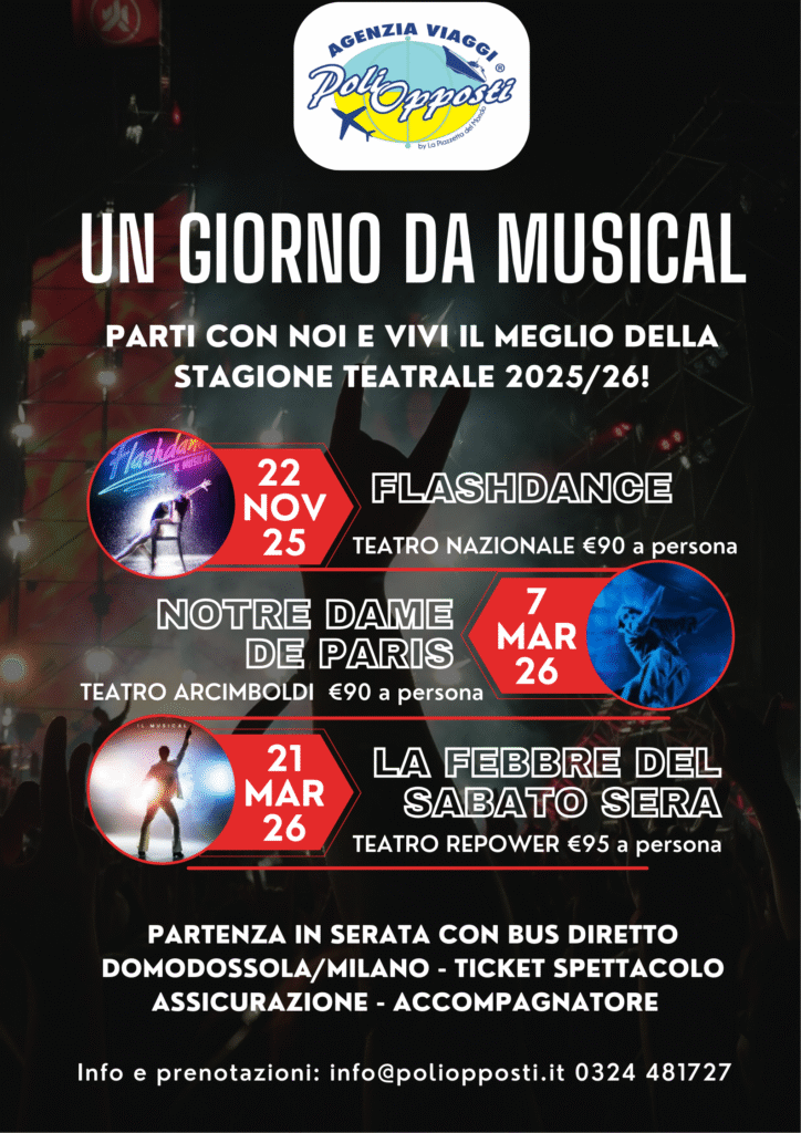 Se ami i musical e vuoi vivere un’esperienza unica senza preoccuparti dell’organizzazione, l’Agenzia Viaggi Poli Opposti ha preparato per te una proposta imperdibile: “Un giorno da musical”, tre appuntamenti esclusivi con i grandi spettacoli della stagione teatrale 2025/26!